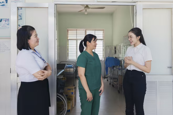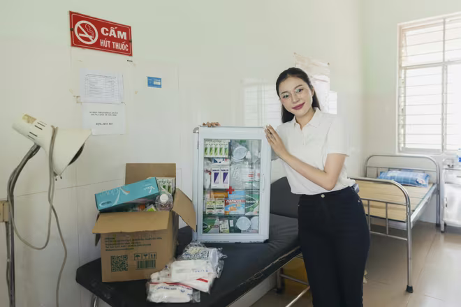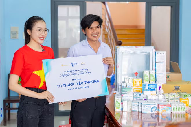 Đến với Trạm y tế xã Tân Hội, Hoa hậu Kiều Duy nhận sự chào đón ấm áp từ lãnh đạo và nhân viên y tế địa phương khi mang tủ thuốc, nước muối, bông băng, cùng một số vật dụng khác để bổ sung thêm cho trạm.