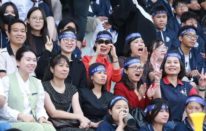 Khi đã chung niềm đam mê với bóng đá, các thầy cô, các bậc phụ huynh cũng cuồng nhiệt chẳng kém các em học sinh. Trong ảnh, đội ngũ CĐV hùng hậu của THPT Nguyễn Huệ mang đến sân Tây Hồ một không khí vừa sôi nổi, vừa văn minh.